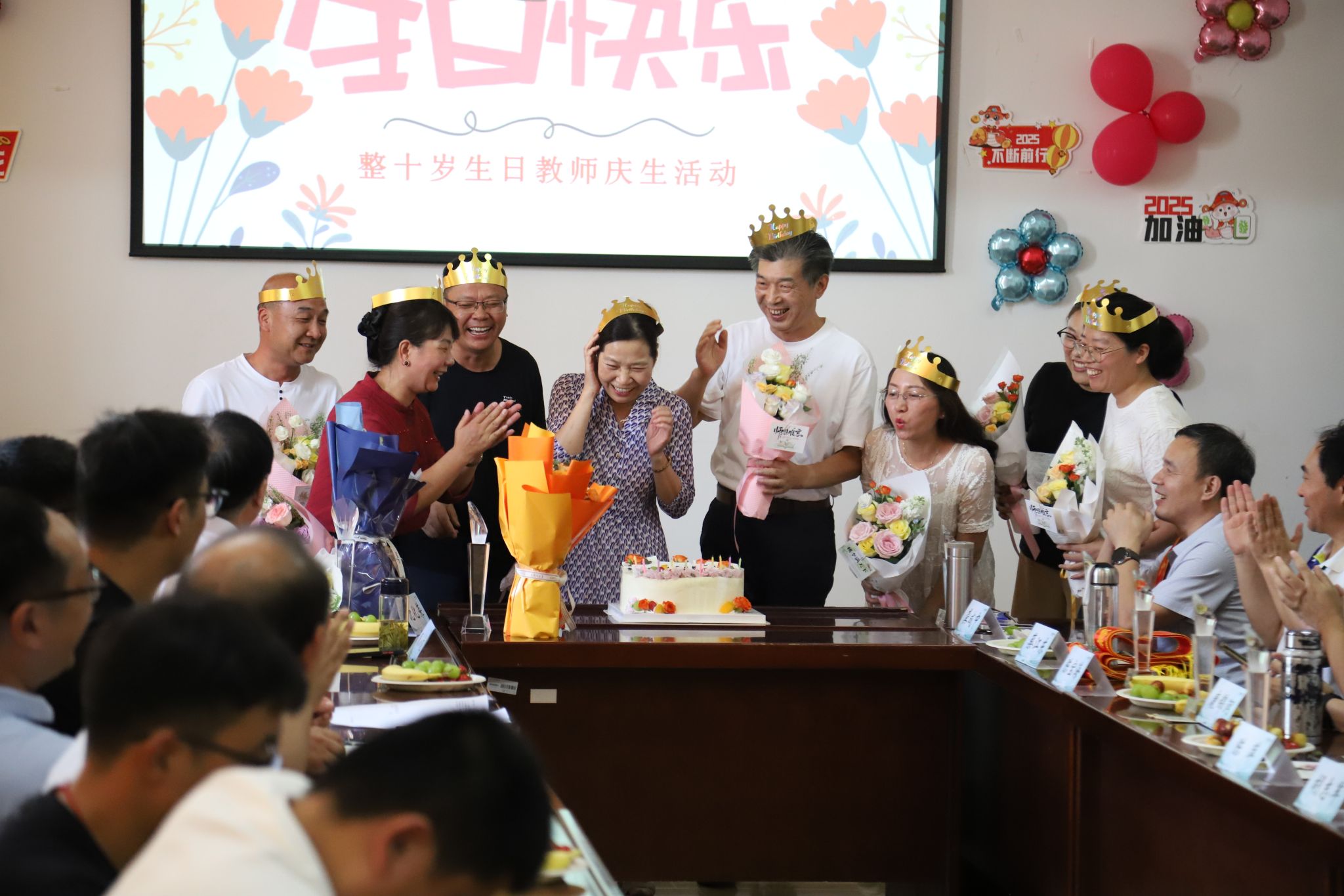本次活动特别为逢整十生日的教师举办了集体生日庆祝。六十岁的沈化荣、束小龙老师,五十岁的夏雪芹、周云艳、胡志军、李建老师,四十岁的张茜、王天驰老师收到了来自学院精心准备的生日礼物和鲜花。全体教师齐唱生日歌,分享甜蜜的蛋糕,现场气氛温馨而欢乐。