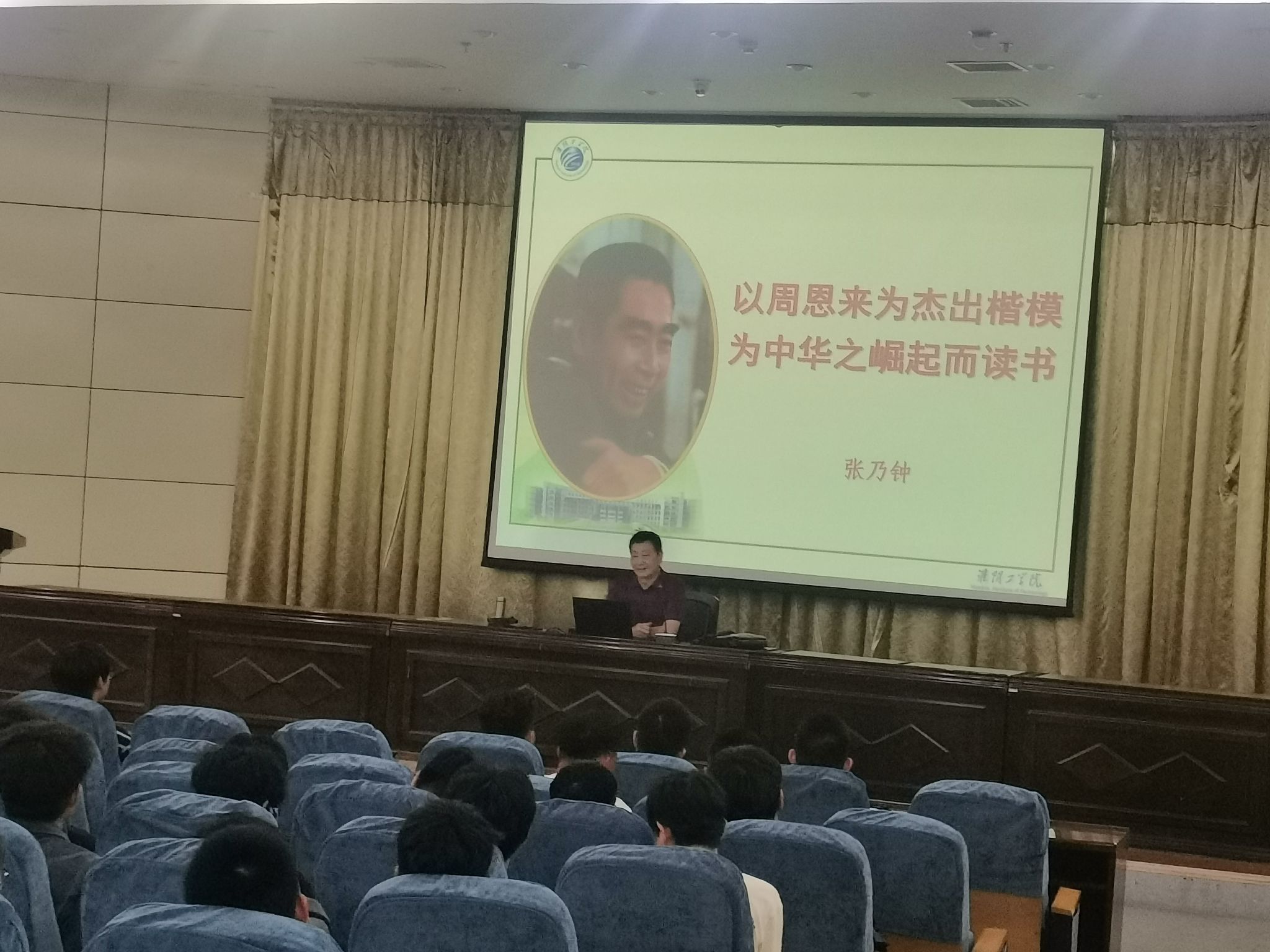 张乃钟首先向学生介绍周恩来与其故乡淮安的历史。从周恩来少年时代的勤奋好学,志向远大到成为中华人民共和国杰出领导人的高风亮节,廉洁自律。张乃钟主任借此点出会议主题:我们要以“周恩来为杰出楷模,为中华崛起而读书”。