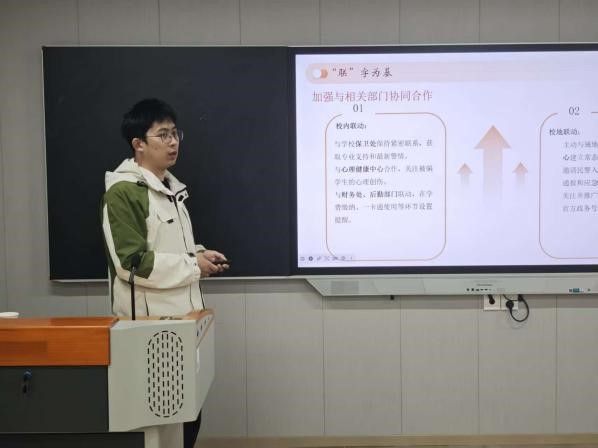接着,吴翔聚焦辅导员防范电信诈骗工作,提出需从“防、教、管、联”四方面构建防控体系:建立金字塔式信息预警网络,及时用身边案例开展教育;分年级精准施策,大一讲基础防骗知识、大二大三辨日常风险、大四防求职诈骗;通过主题班会、情景剧等形式提升宣传实效;对受骗学生做好心理疏导,并联动学校保卫处、属地公安机关等形成协同机制,全面筑牢学生反诈防线。