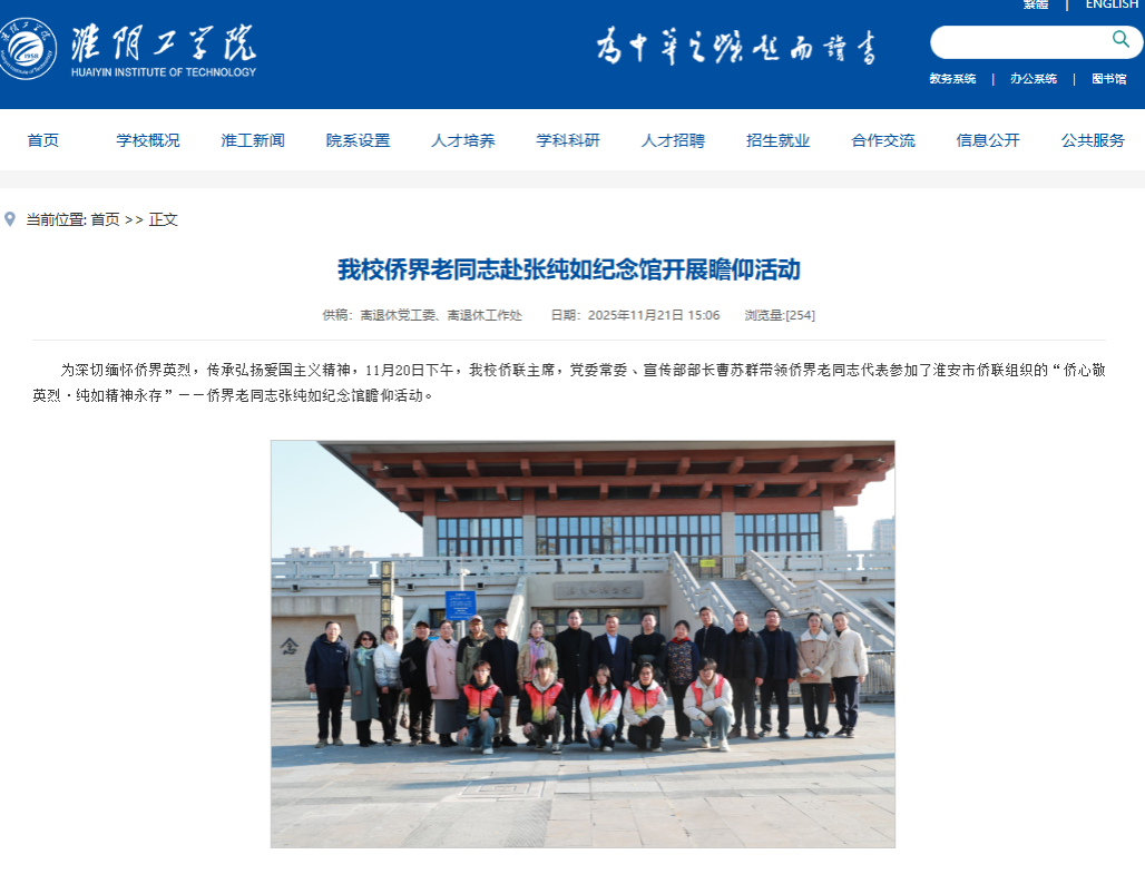 曹苏群表示,张纯如女士用青春与生命为历史立证,她的精神不仅是中华民族的宝贵财富,更是激励广大侨界人士爱国爱乡、担当作为的强大动力。学校侨联将以此次瞻仰活动为契机,进一步凝聚侨心、汇聚侨智、发挥侨力,引导全校侨界师生及眷属以更加饱满的热情投身于学校发展和地方建设事业中。