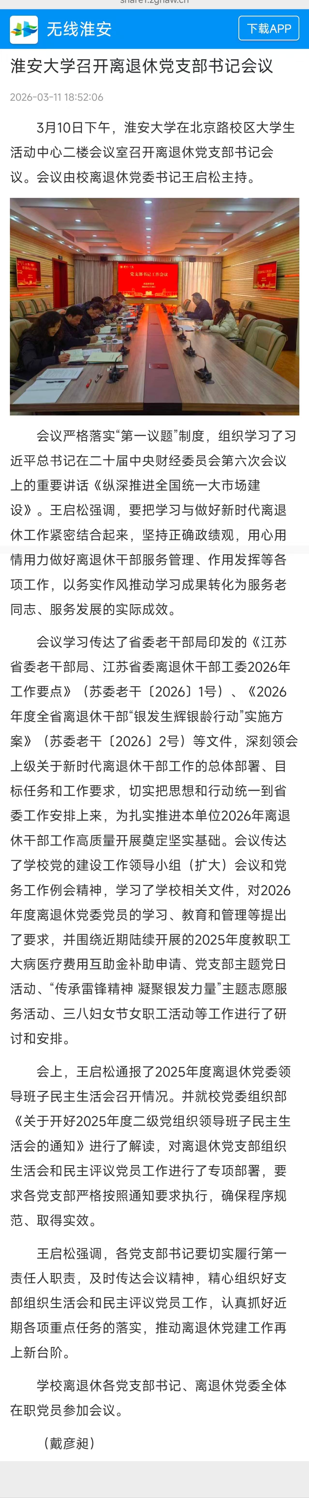【无线淮安】淮安大学召开离退休党支部书记会议