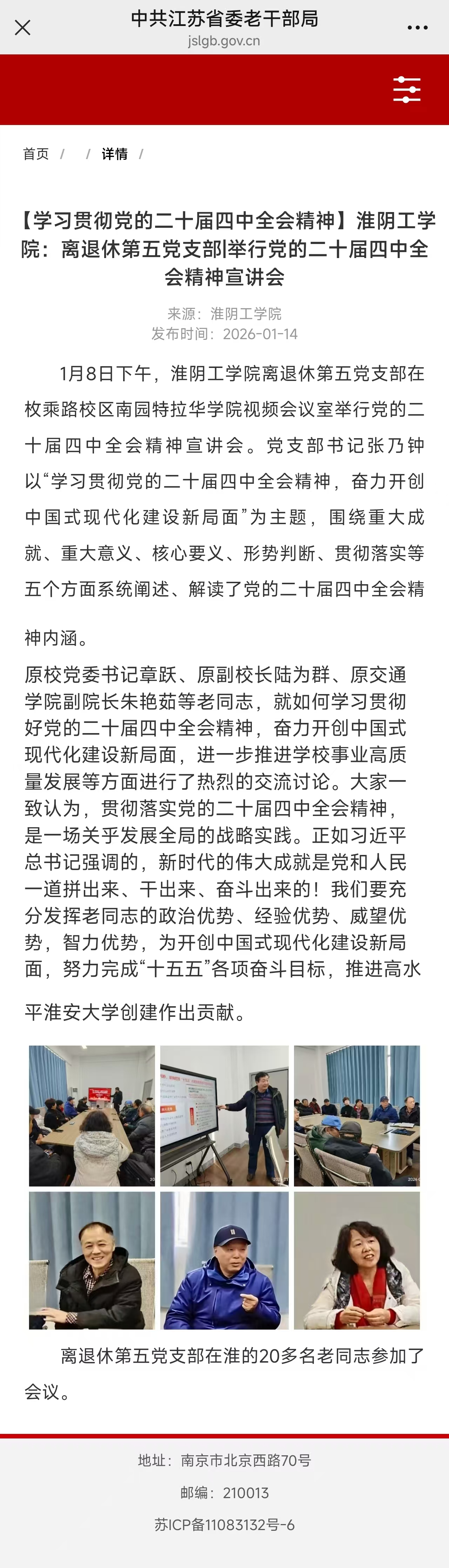 【省委老干部局网站】淮阴工学院:离退休第五党支部举行党的二十届四中全会精神宣讲会